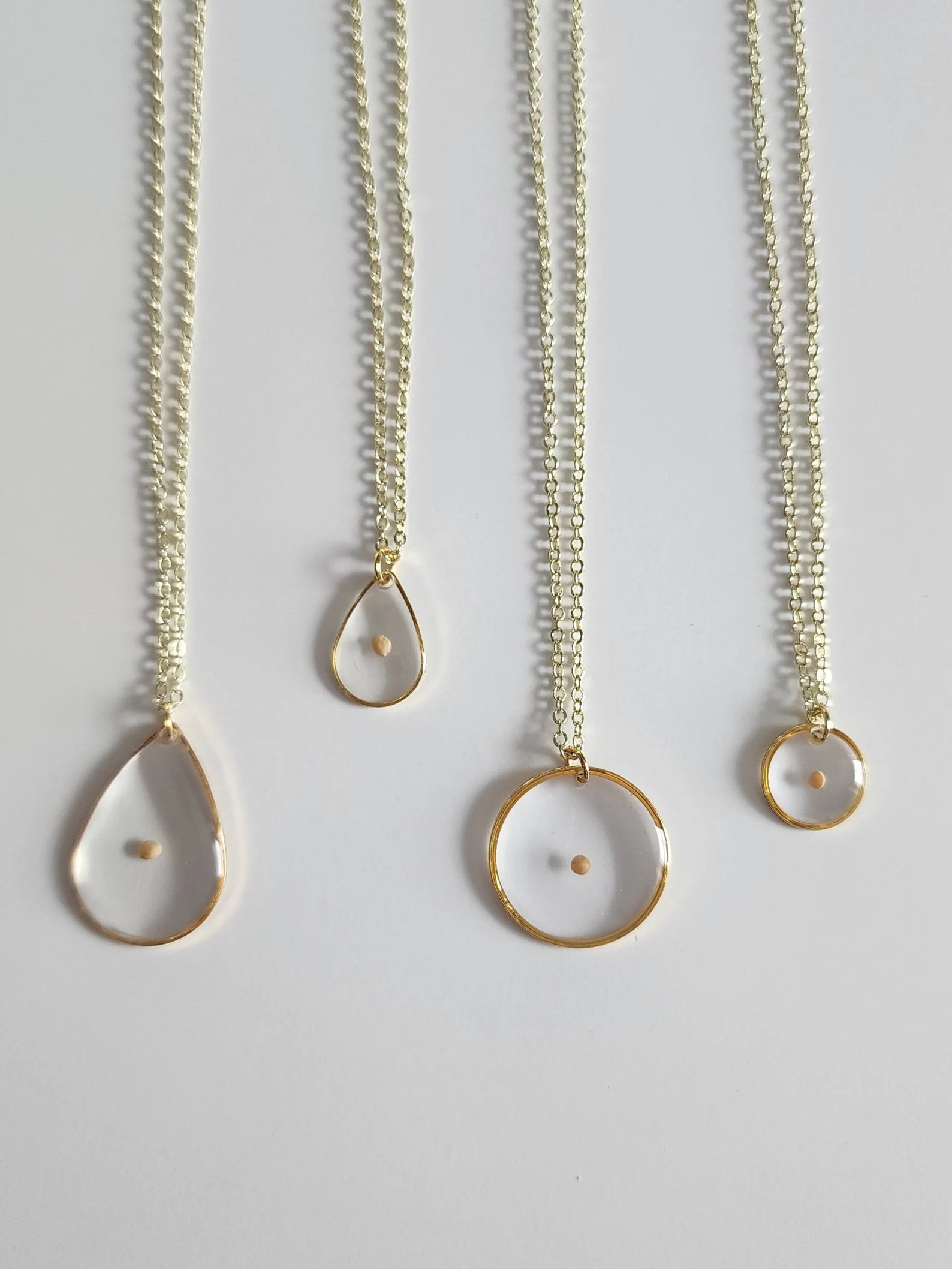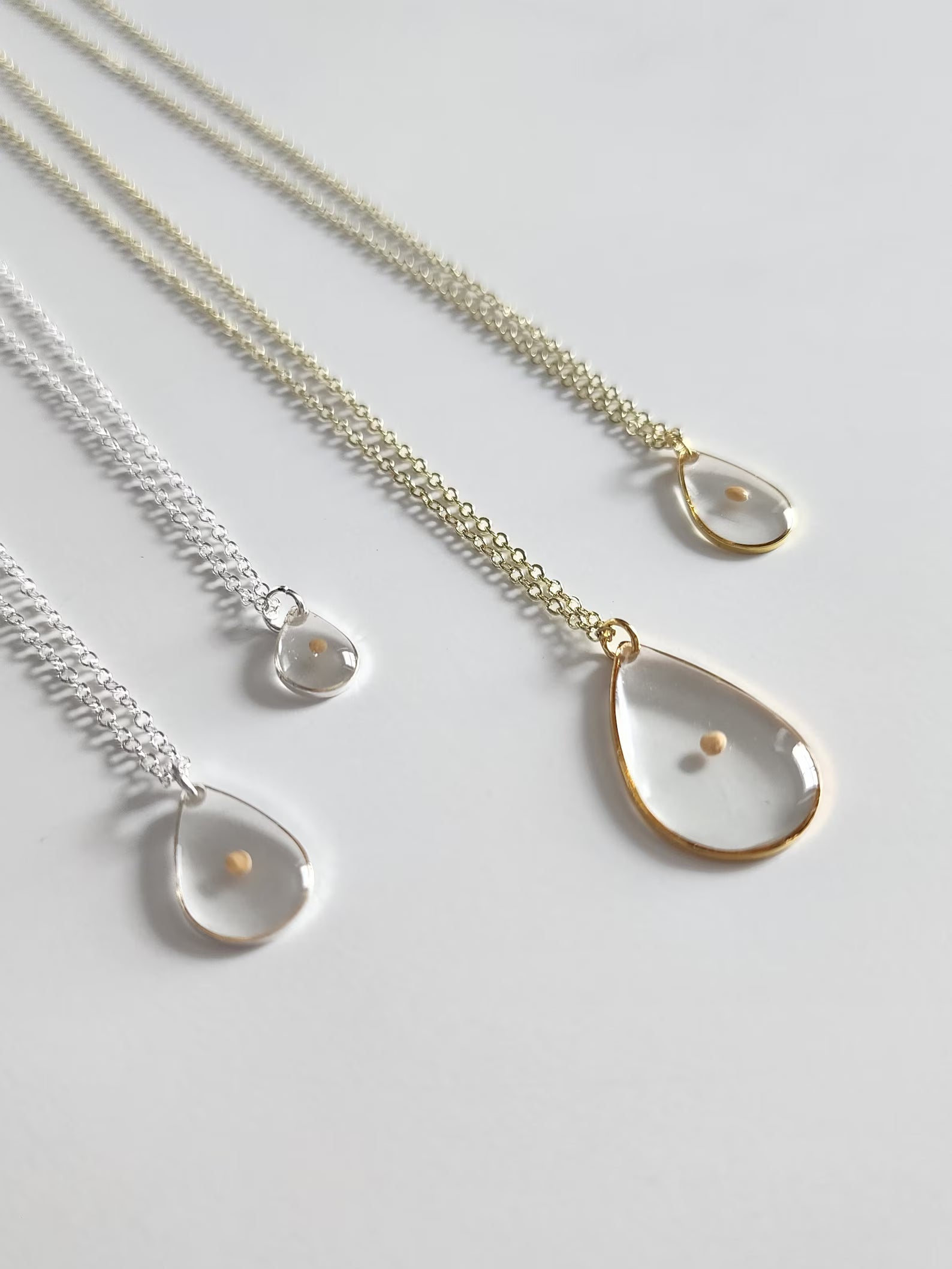 - Pendant: Real mustard seed encased in clear resin within a gold round frame